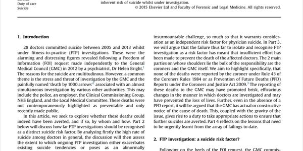 28 doctors committed suicide between 2005 and 2013 whilst under fitness-to-practise (FTP) investigations. These were the alarming and distressing figures revealed following a Freedom of Information (FOI) request made independently to the General Medical Council (GMC) in 2012 by a psychiatrist, Dr Helen Bright.1 The reasons for the suicide are multitudinous. However, a common theme is the stress and threat of investigation by the GMC and the painfully named ‘death by 1000 arrows’ 2 associated with an almost simultaneous investigation by various other authorities. This may include the police, an employer, the Clinical Commissioning Group, NHS England, and the Local Medical Committee. These deaths were not contemporaneously highlighted as preventable and only recently made public. In this article, we seek to explore whether these deaths could indeed have been averted, and if so, by whom and how. Part 2 below will discuss how far FTP investigations should be recognised as a distinct suicide risk factor. By analysing firstly the high rate of suicide among doctors in general, the discussion will then assess the extent to which ongoing FTP investigation either exacerbates existing suicide tendencies or poses as an abnormally insurmountable challenge, so much so that it warrants consideration as an independent risk factor for physician suicide. In Part 3, we will argue that the failure thus far to isolate and recognise FTP investigation as a risk factor has meant that insufficient effort has been made to prevent the death of the affected doctors. The 2 main parties on whose shoulders lie the bulk of the responsibility are the coroners and the GMC itself. We aim to highlight specifically, that none of the deaths were reported by the coroner under Rule 43 of the Coroners Rules 1984 or as Prevention of Future Deaths (PFD) Reports under the Coroners and Justice Act 2009.3 The reporting of these deaths to the GMC may have promoted brisk, efficacious changes in the manner in which doctors are investigated and may have prevented the loss of lives. Further, even in the absence of a PFD report, it will be argued that the GMC has actual or constructive notice of the cause of death. This, coupled with the gravity of the issue, gives rise to a duty to take appropriate actions to ensure that further suicides are averted. Part 4 reflects on the lessons that need to be urgently learnt from the array of failings to date.